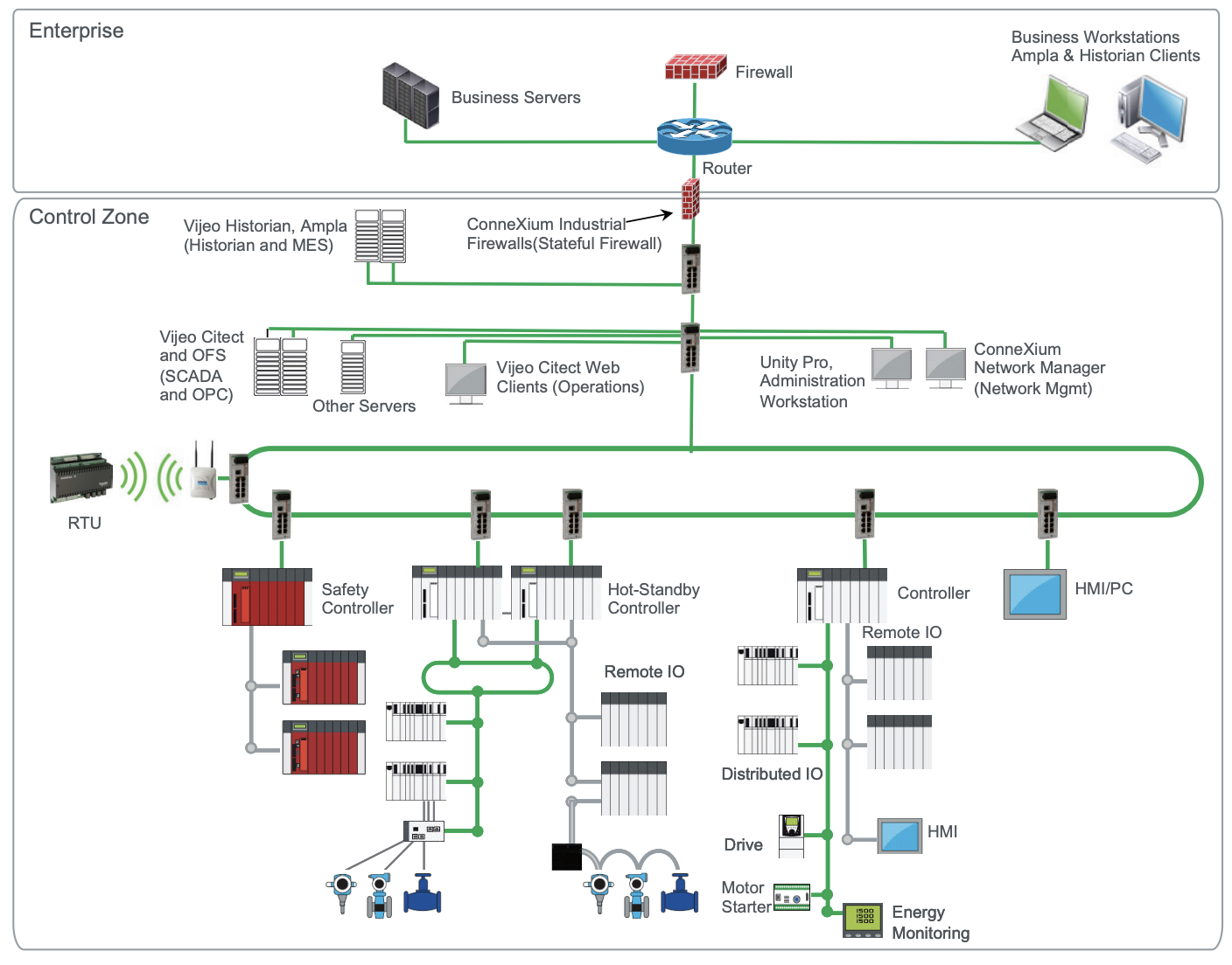 In the following document, named Practical Overview of Implementing IEC 62443 Security Levels in Industrial Control Applications, Schneider Electric explains how the different Security Levels may be implemented based on the architecture depicted below.